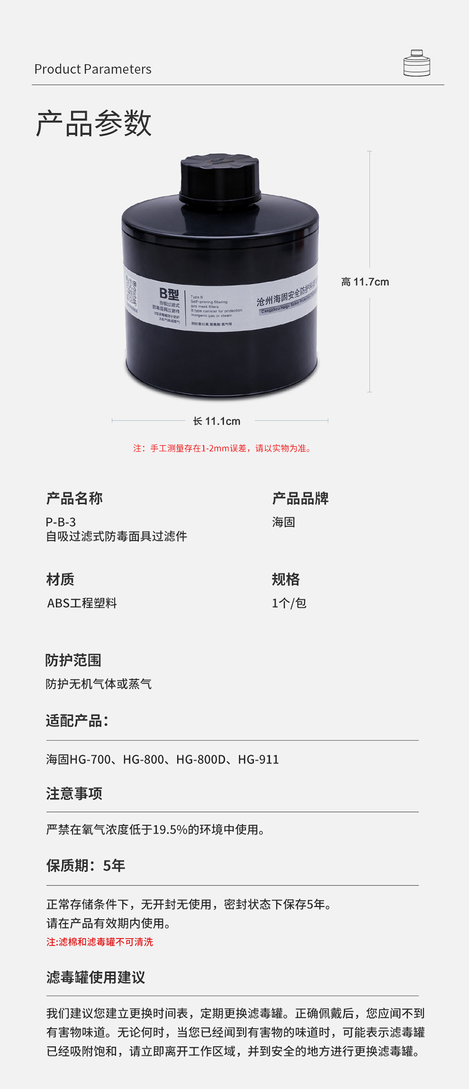 產(chǎn)品規(guī)格:ABS濾毒罐